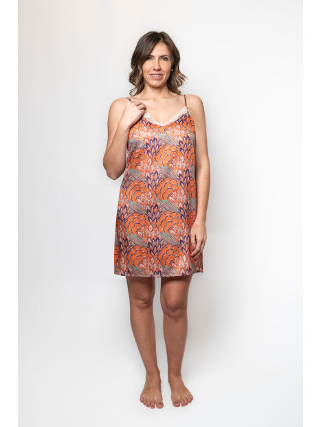 Son imprimé graphique aux notes orangées évoque chaleur, évasion et sensualité. On craque pour ses fines bretelles réglables et son délicat décolleté orné de dentelle, qui soulignent joliment la silhouette. Fluide et légère, elle glisse sur la peau pour vous offrir un confort irrésistible du soir au matin.