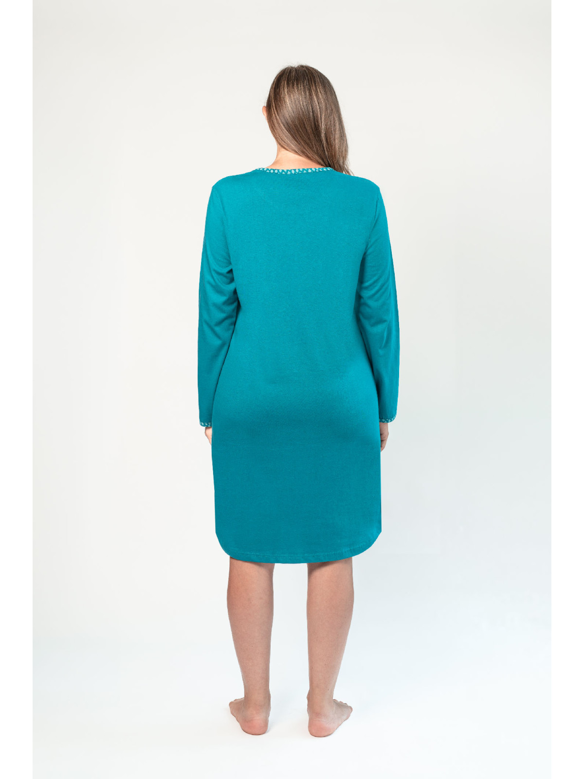Vous trouverez une encolure ronde accompagnée d'un bordage imprimé qui fait écho à celui des poignets. Ajoutant ainsi une touche de fantaisie à l'ensemble.