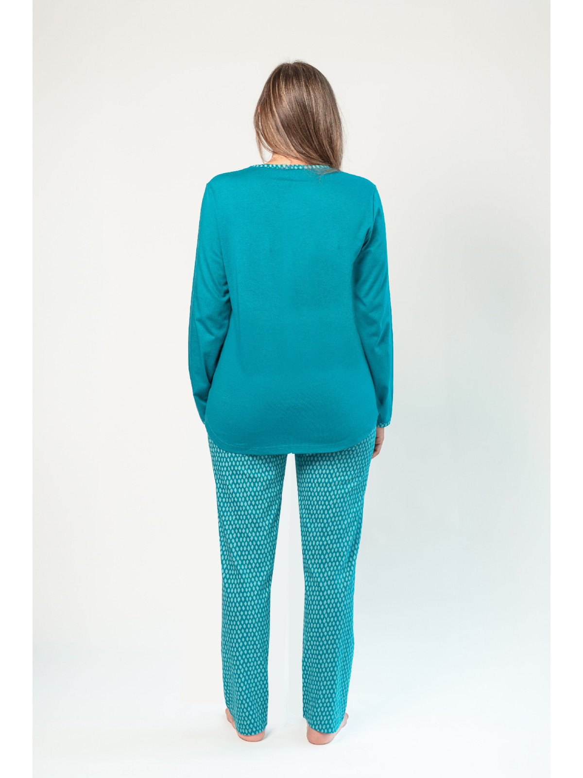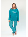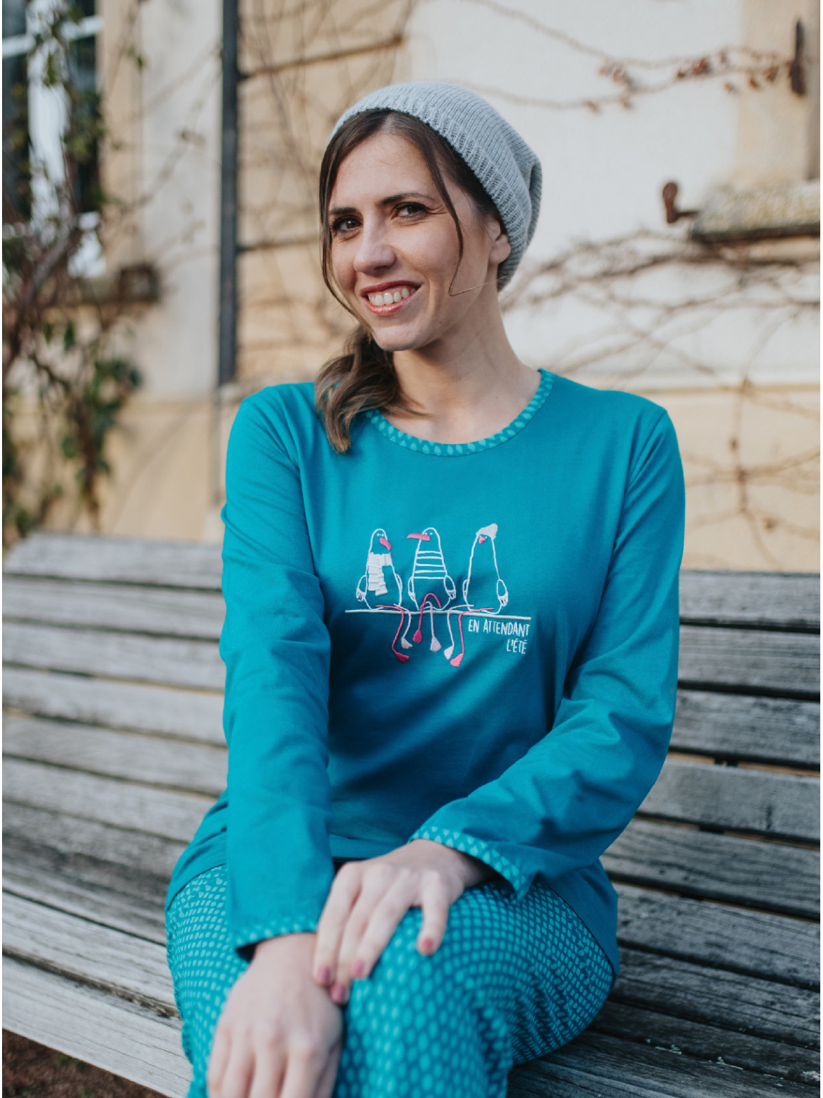 Envie d’un pyjama original pour l’hiver, préparez-vous avec notre pyjama « mouettes ». Ce pyjama se compose d’un haut original de couleur vert canard, doté d’une broderie illustrant des mouettes attendant l'été.
