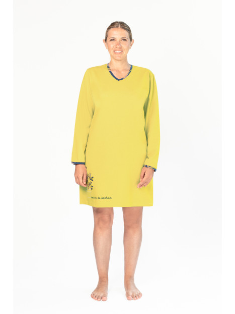 Cette liquette chaude en molleton gratté anis, possède une broderie fantaisie de plante, accompagnée de la phrase "bouture de bonheur". Cette dernière est située sur le bas devant.