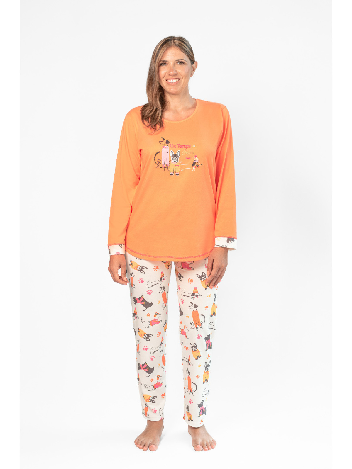 Envie d’un pyjama coloré pour l’hiver, découvrez notre pyjama « Un temps de chien». Ce pyjama se compose d’un haut uni de couleur orange. Il est doté d’une broderie fantaisie de chiens habillés pour l'hiver, avec des bonnets, pulls & écharpes.