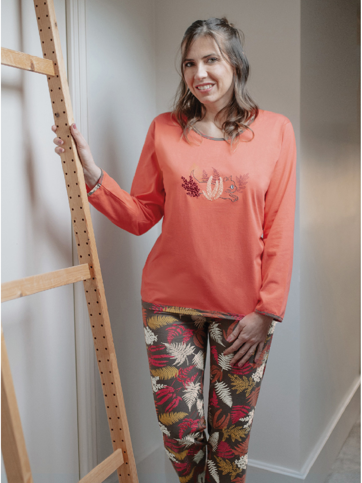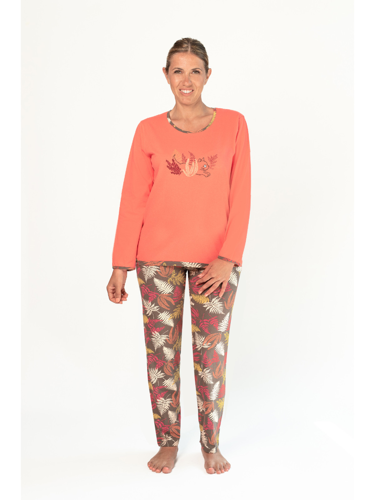 Envie d’un pyjama coloré pour l’hiver, découvrez notre pyjama « Fougères». Ce pyjama se compose d’un haut uni orange. Il possède une broderie humoristique sur le devant. Elle est composée d'un chat se cachant dans des fougères.
