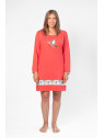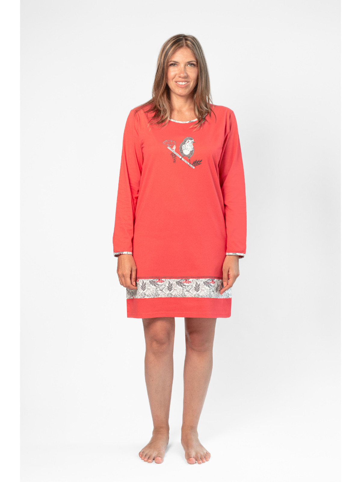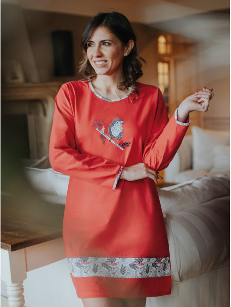 Cette liquette en jersey uni rouge, possède une broderie poétique sur le devant. Elle présente un oiseau sur une branche.