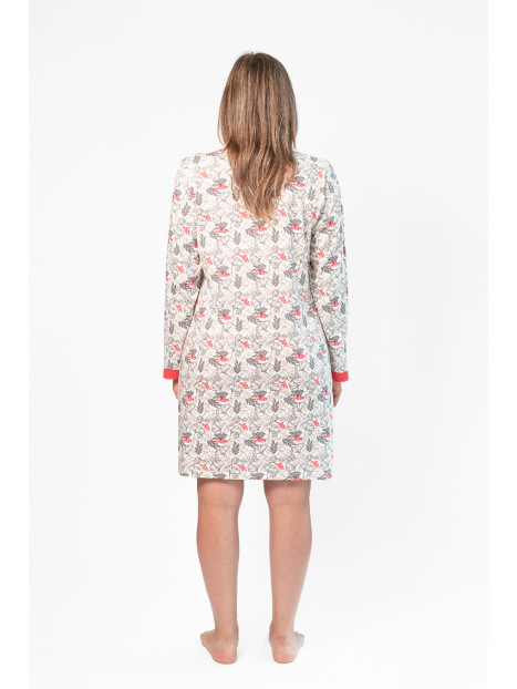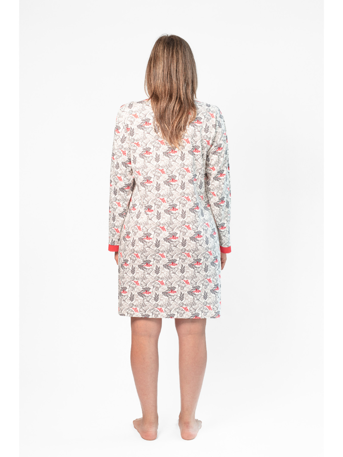 Cette liquette en jersey imprimé, vous présente un motif de feuillage divers gris et rouge, sur un fond écru.