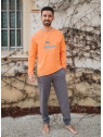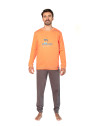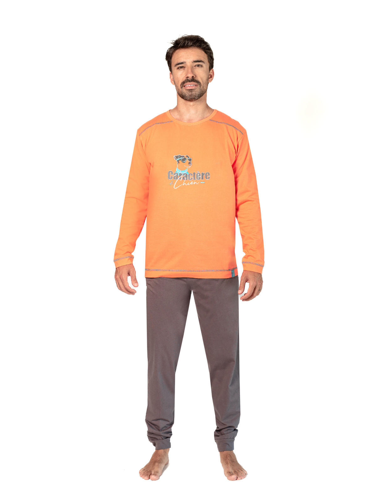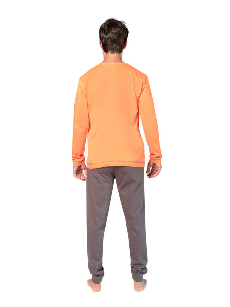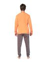 Ce pyjama possède un haut en jersey orange, agrémenté de points de recouvrements turquoises qui viennent réveiller l'ensemble.