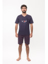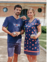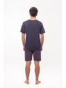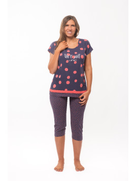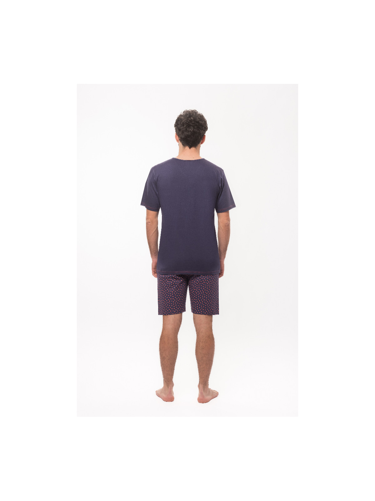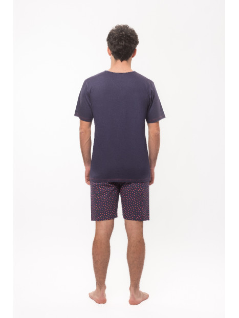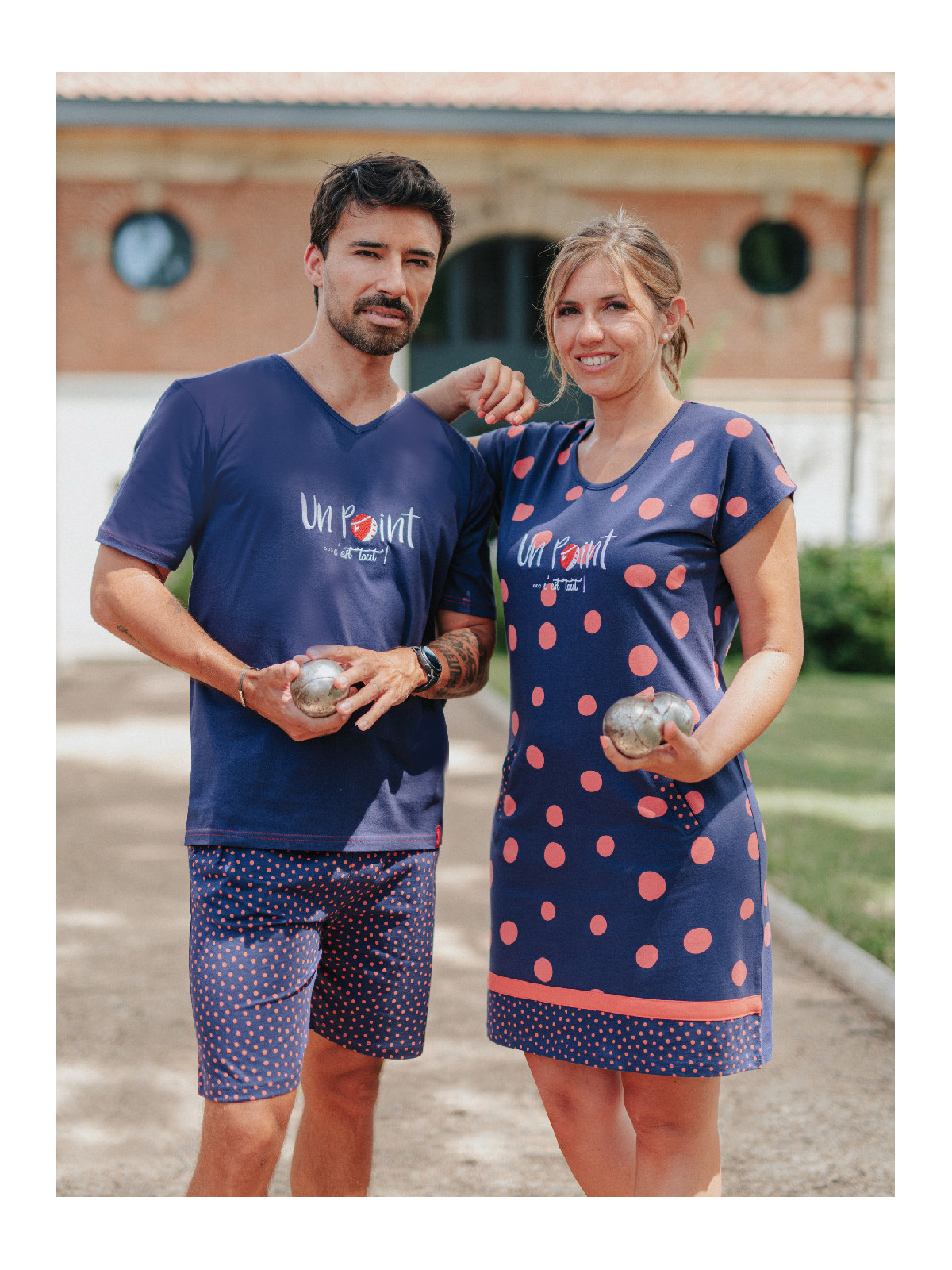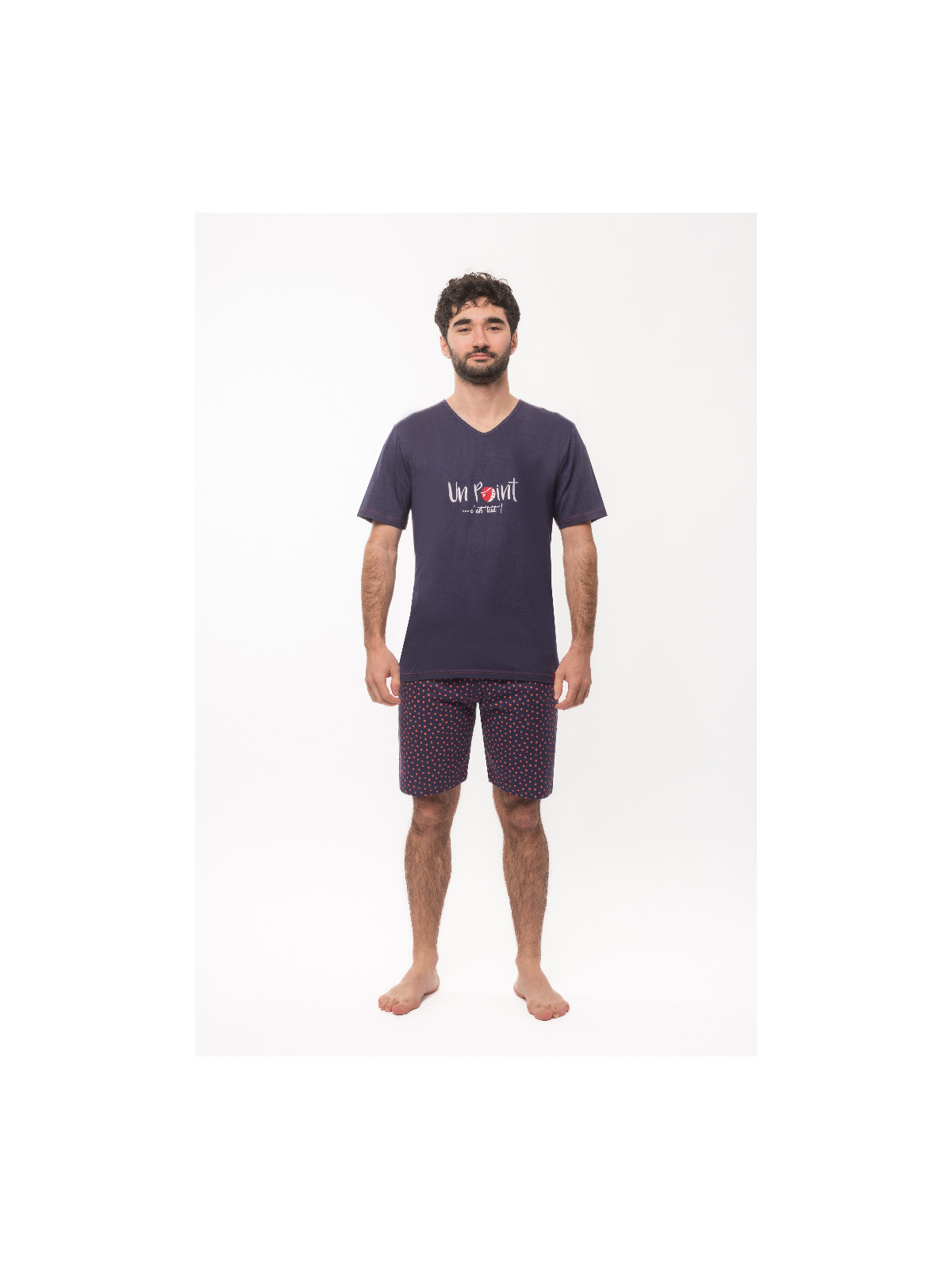 Ce pyjama possède un haut en jersey coloris marine et un short imprimé avec un motif à pois (pois cayenne sur fond marine).