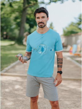 Une sérigraphie est présente sur le devant du t-shirt. On y découvre un joueur de pétanque en train de calculer son tir pour gagner.