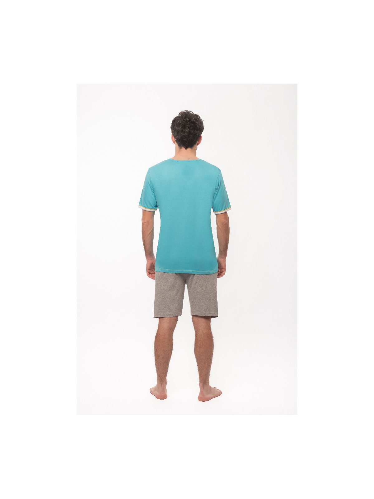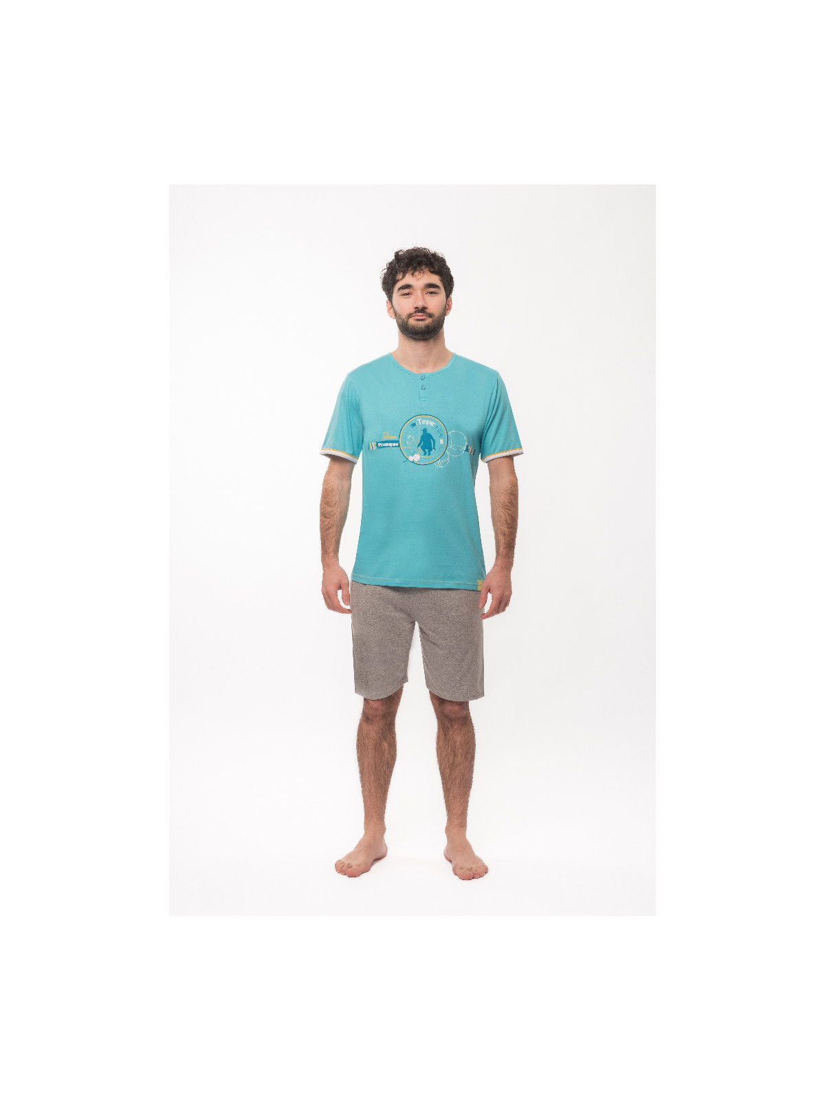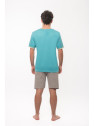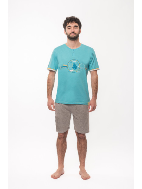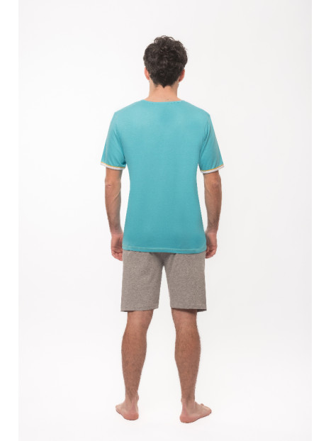 Ce pyjama possède un haut en jersey bleu ciel et un short en jersey gris chiné.