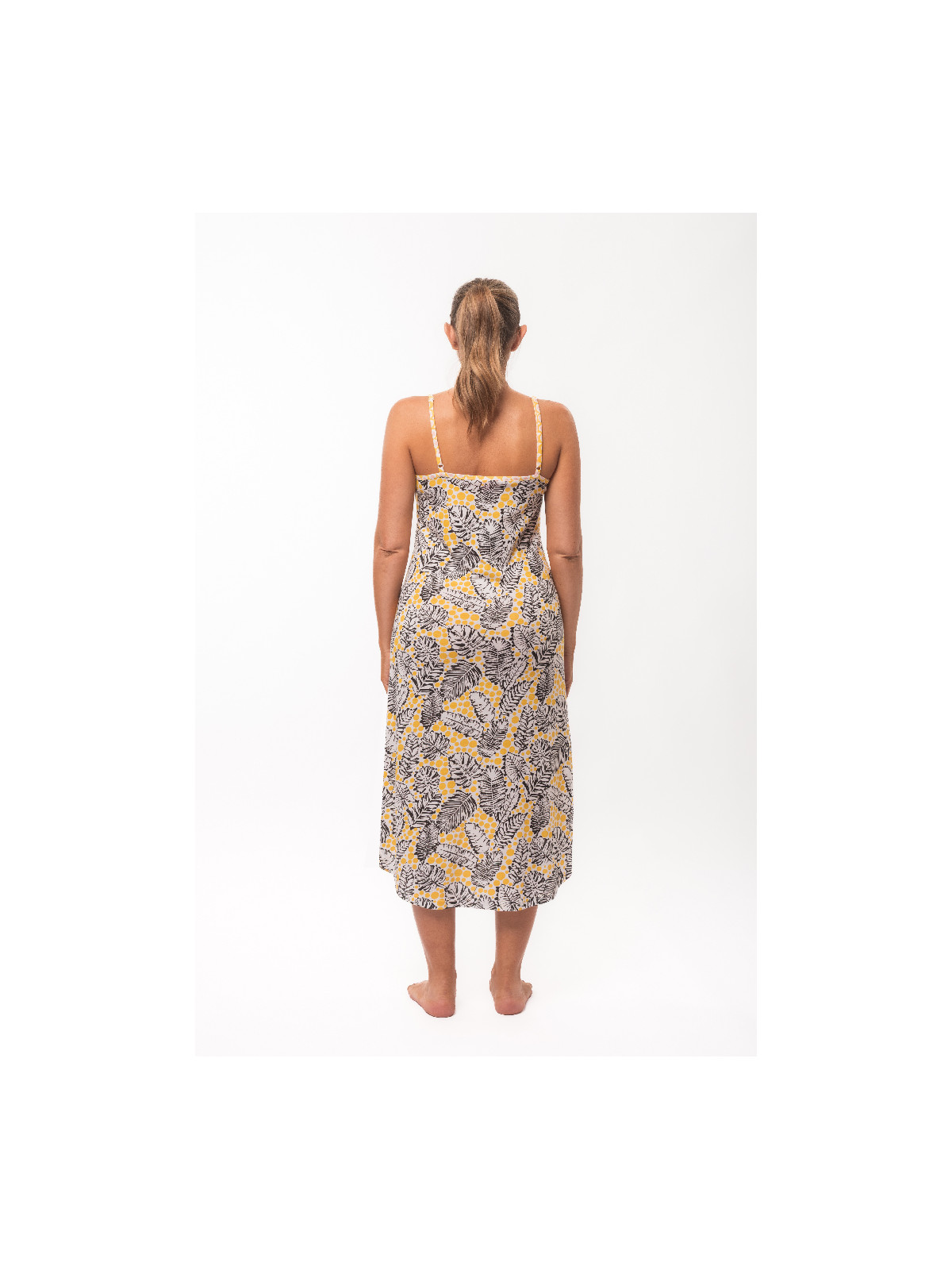 Elle est composée d'un motif de feuilles graphiques noires et blanches sur un fond jaune. Un motif ethnique vient compléter l'ensemble via les bretelles. Le jeu des deux motifs offre un aspect moderne à l'article.