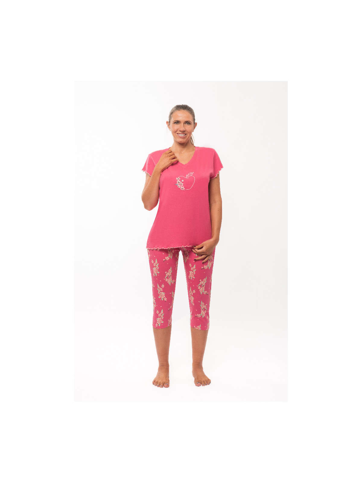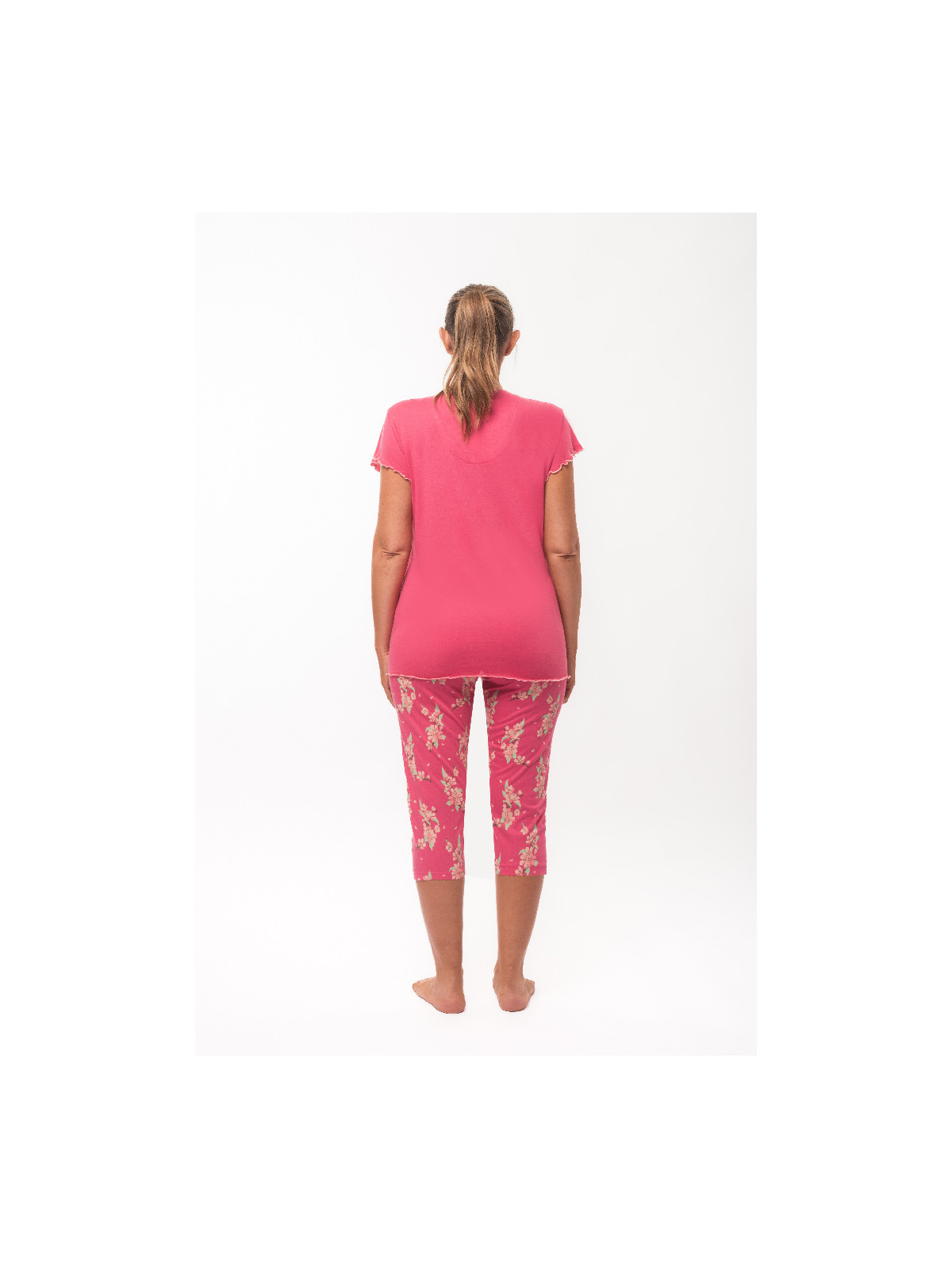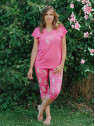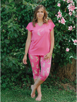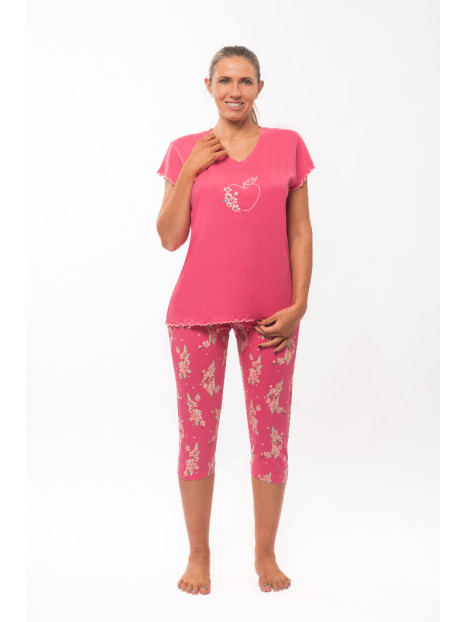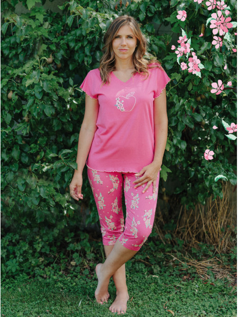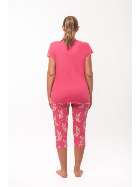 Le haut est en jersey uni fuchsia. Le corsaire est entièrement imprimé.