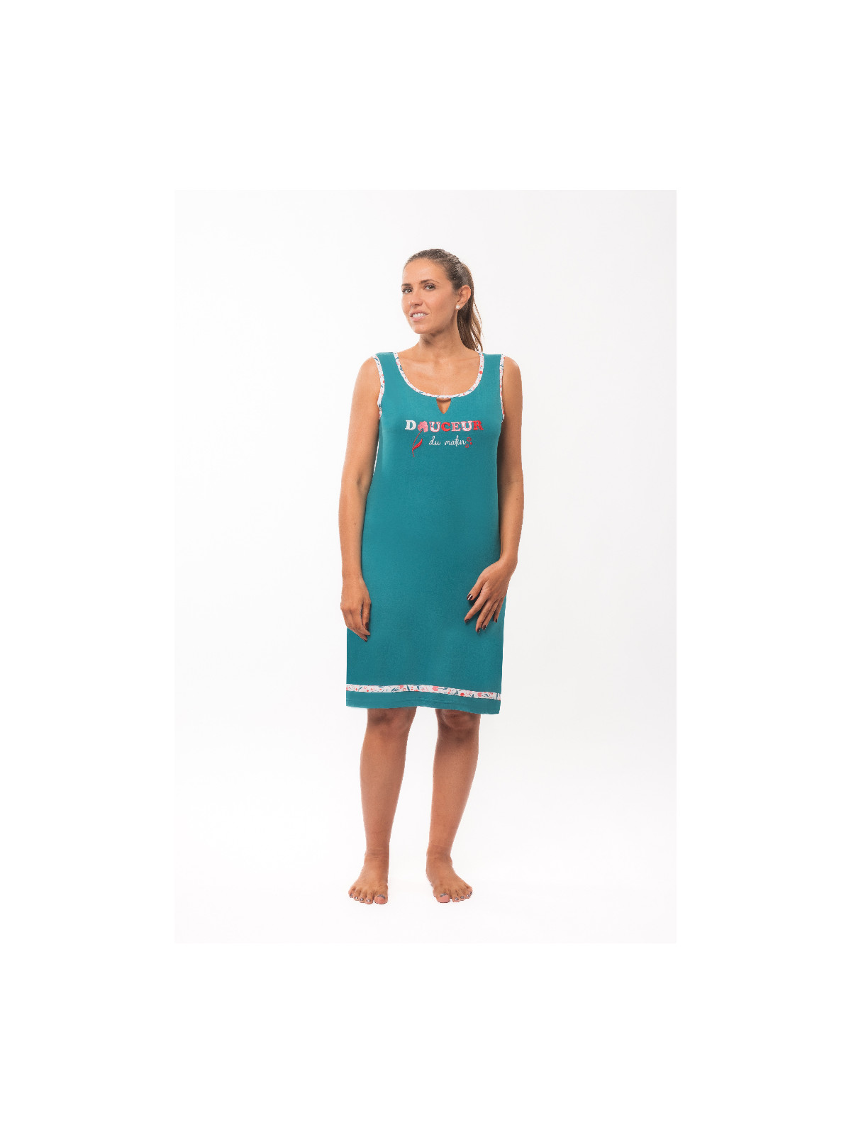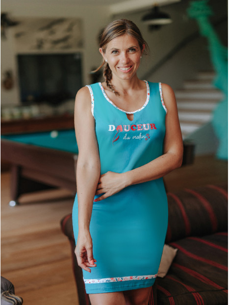 Une broderie est présente sur le devant. Celle-ci est composée de la phrase "Douceur du matin" en lettres multicolores.