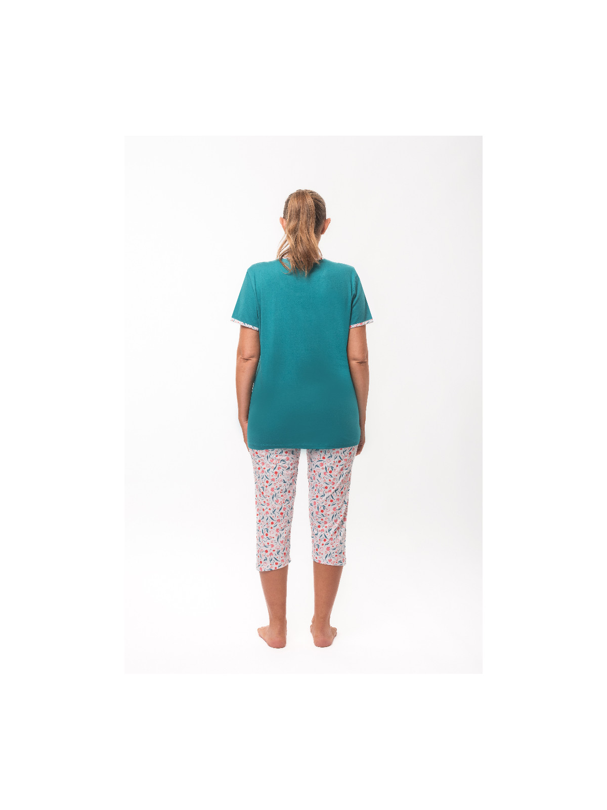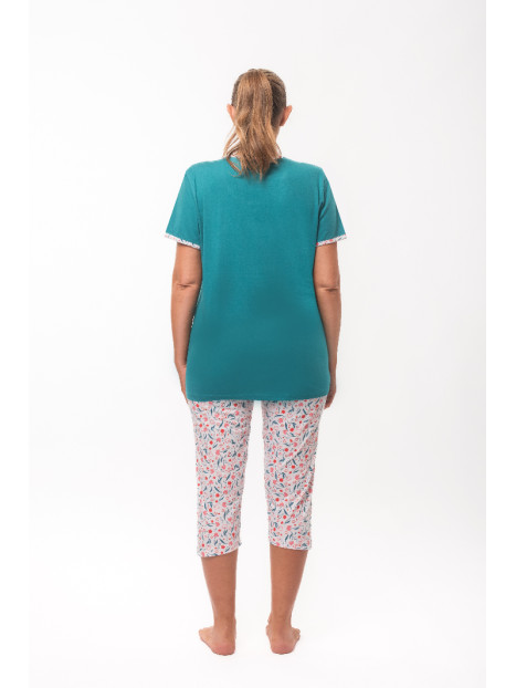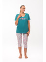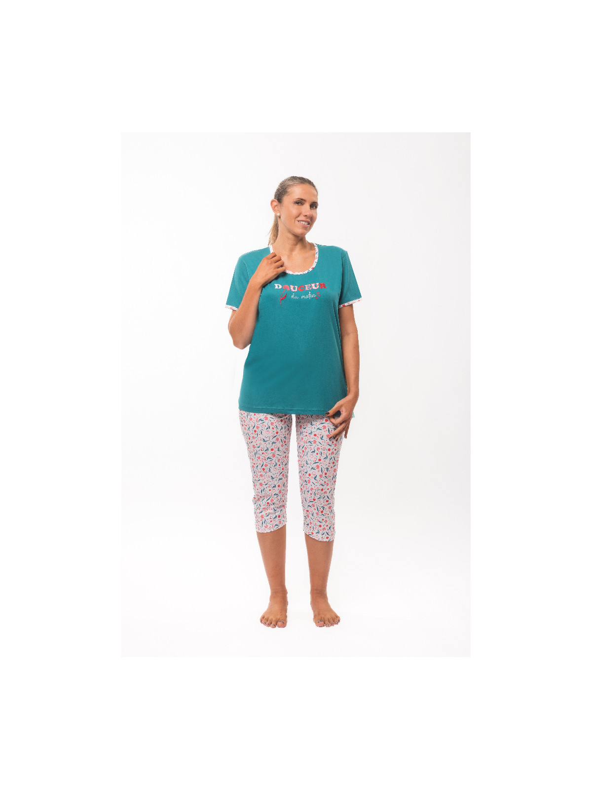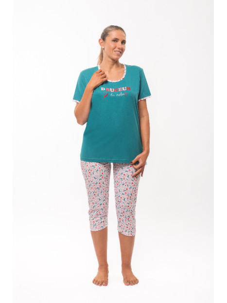 Le haut est en jersey uni bleu canard. Le corsaire est entièrement imprimé.