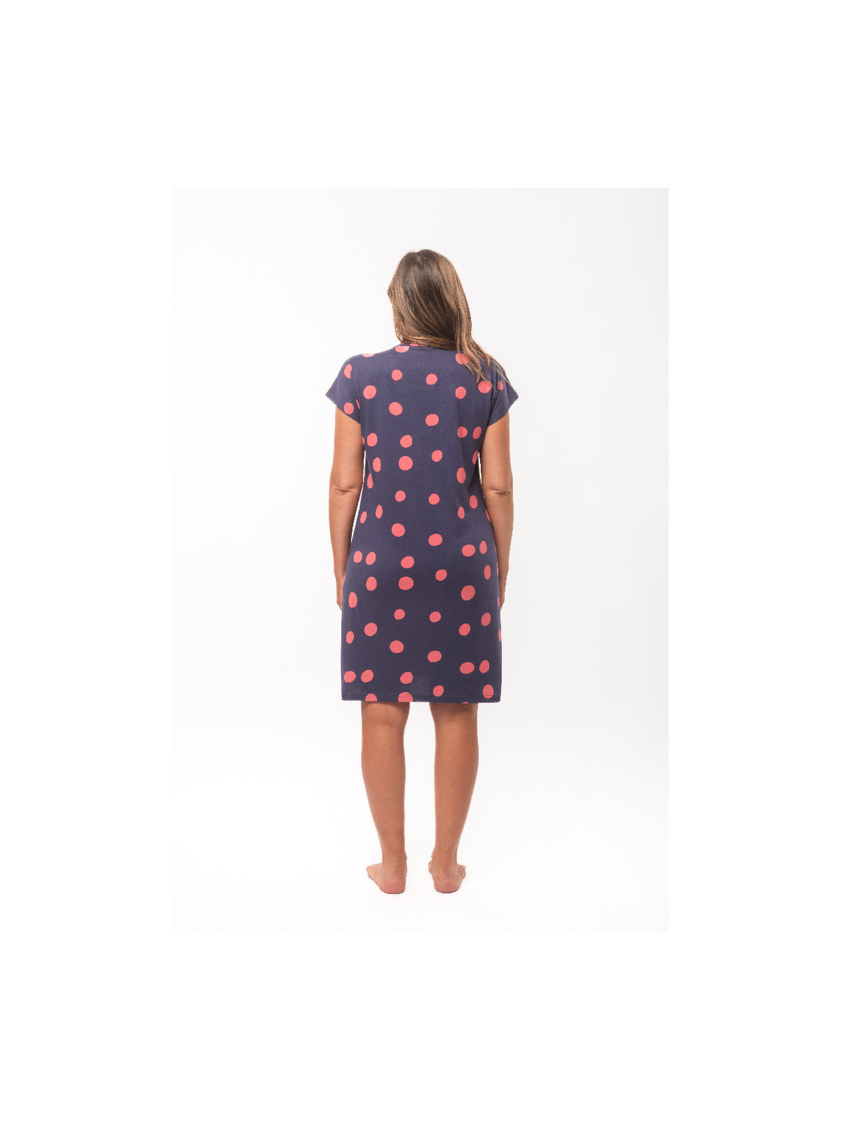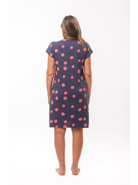 Cette liquette est en jersey imprimé avec un jeu de motif à pois cayenne sur fond marine.