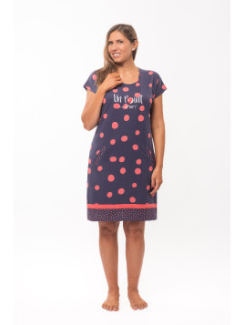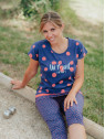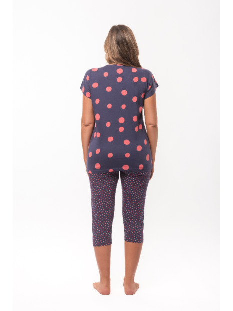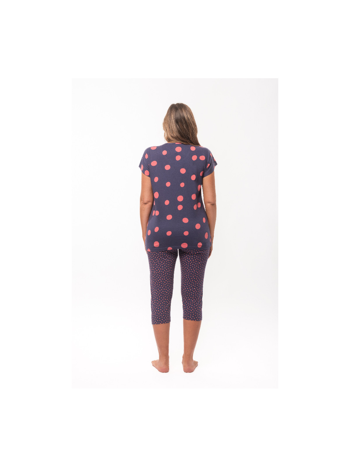 Le haut est en jersey imprimé avec un motif à pois coloris cayenne sur fond marine (grande taille).