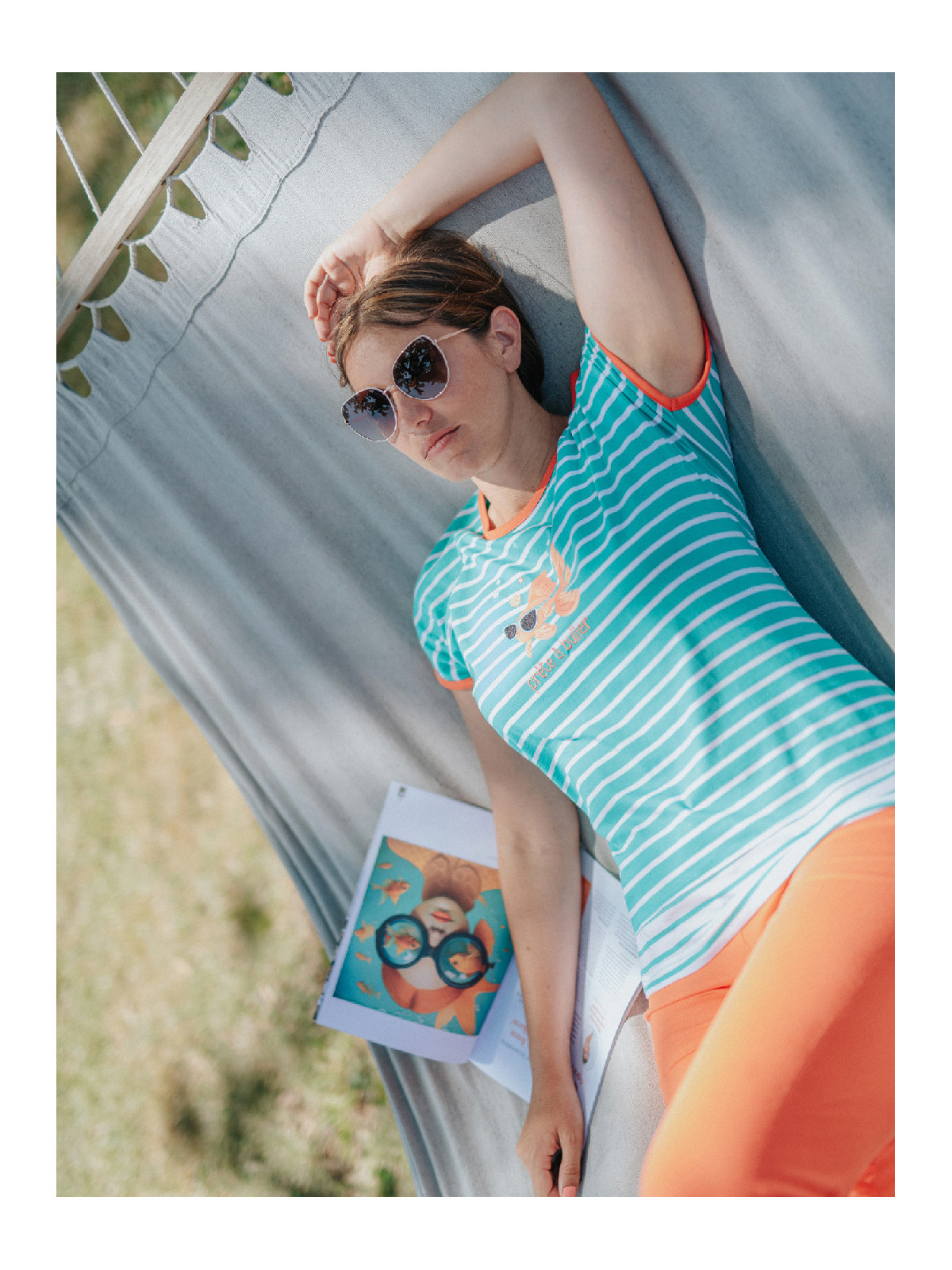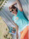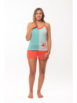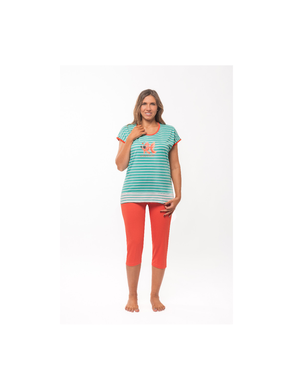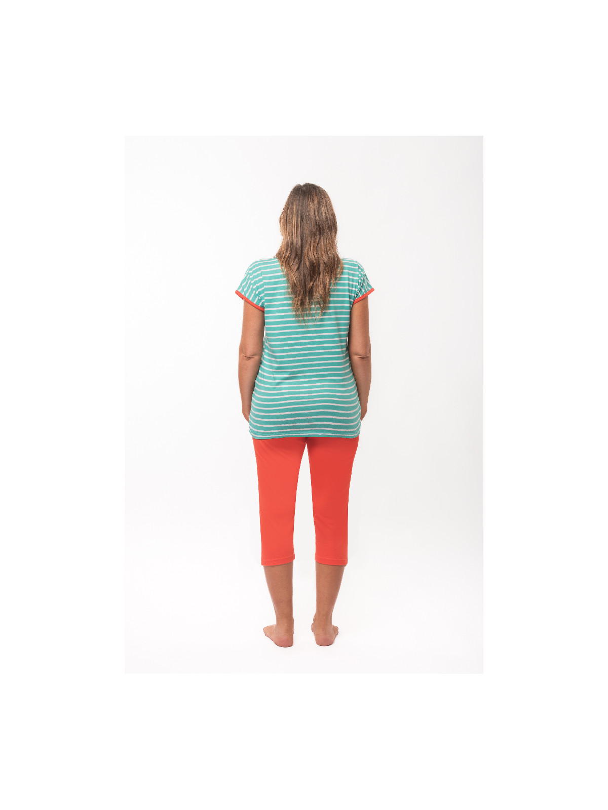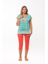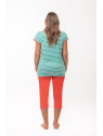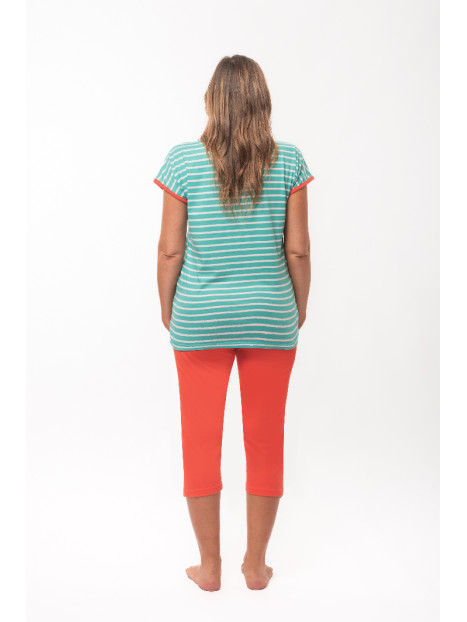 Le haut est en jersey rayé vert et blanc, et le corsaire de coloris mandarine.