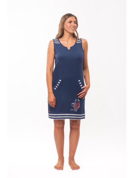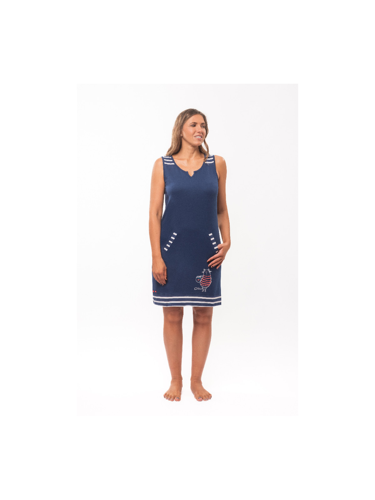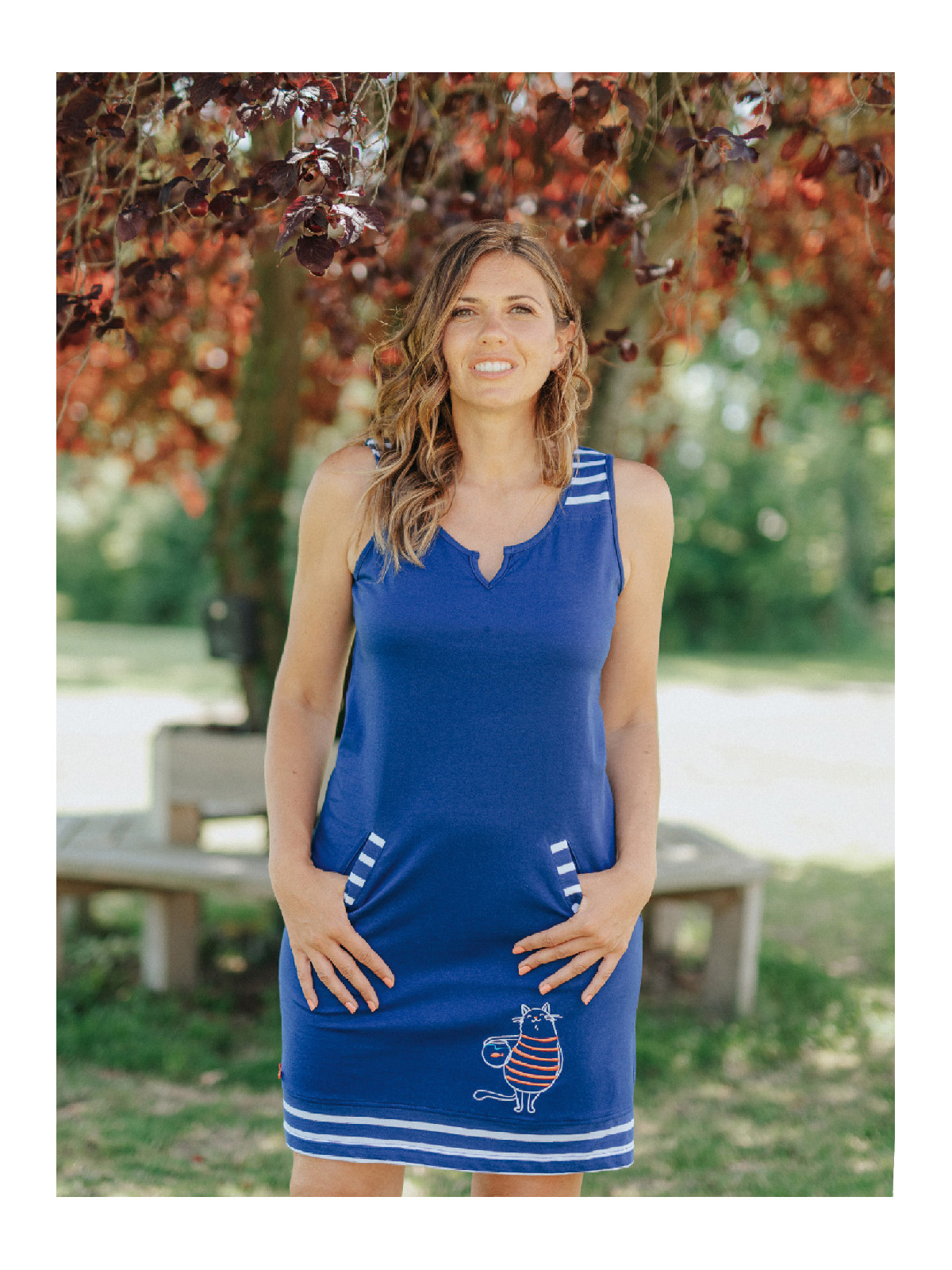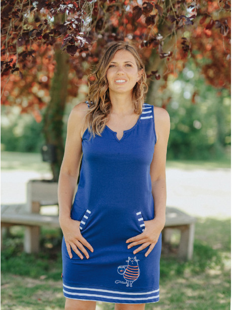 Une broderie est présente sur le devant. Celle-ci est composée d'un chat en marinière rouge tenant dans ses bras un poisson rouge dans un bocal.