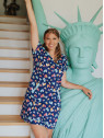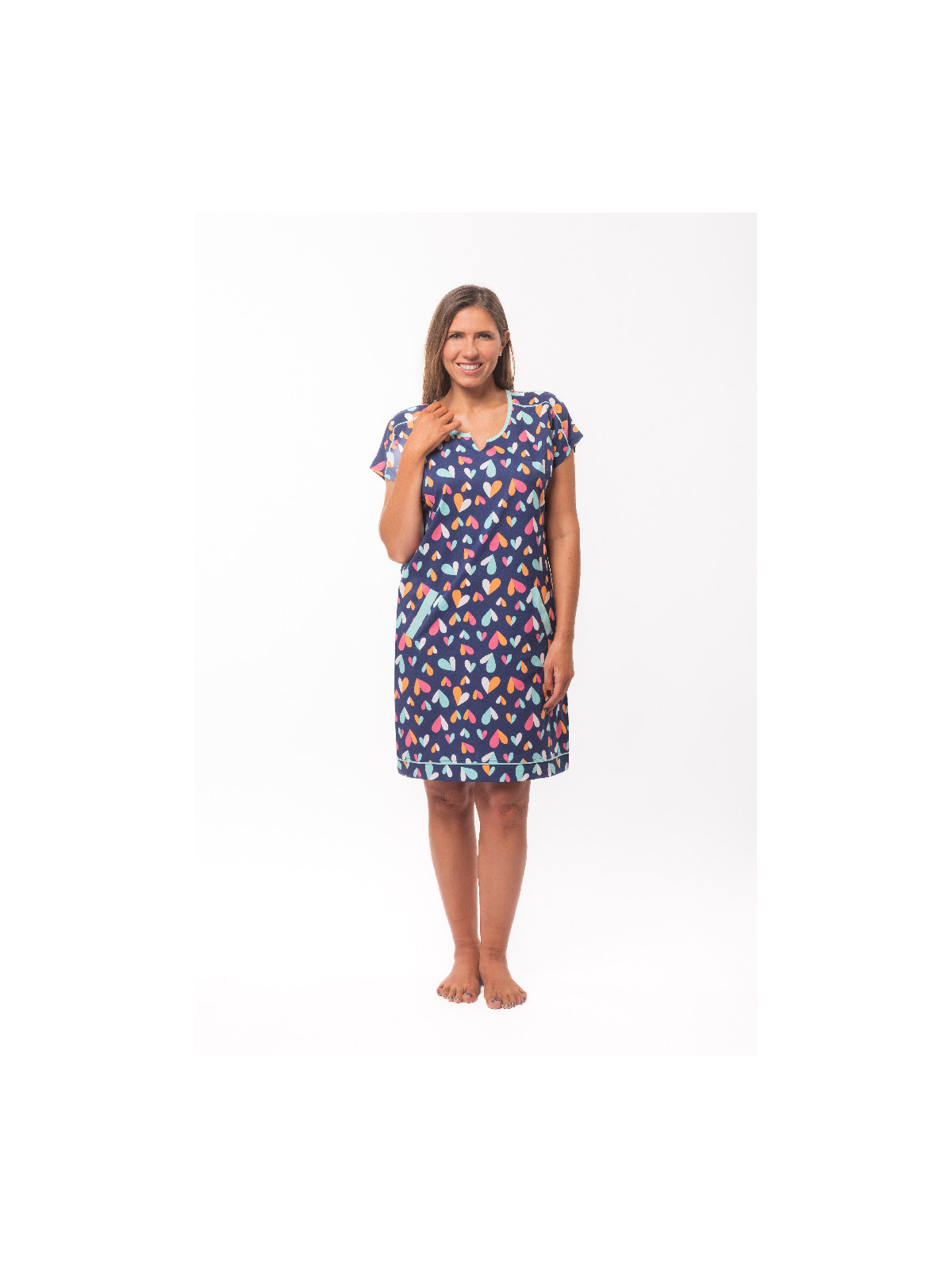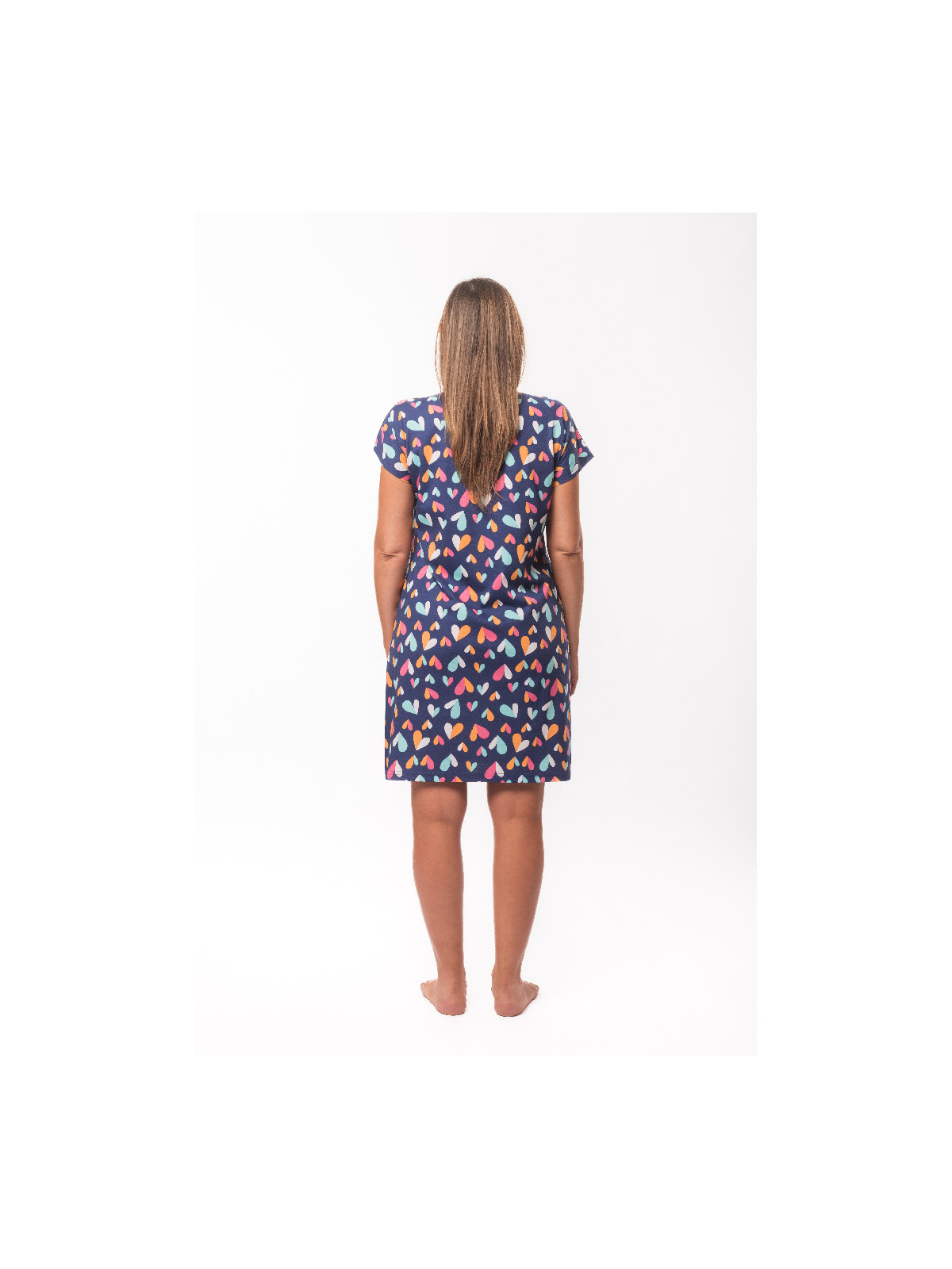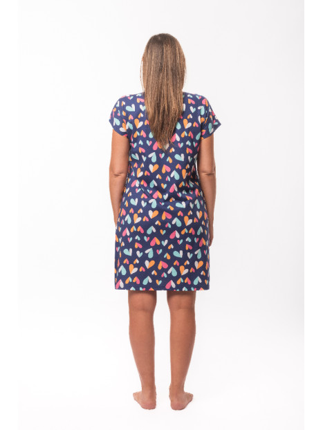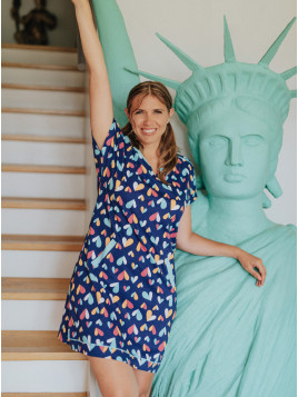Son motif est constitué de cœurs graphiques multicolores sur fond marine.