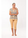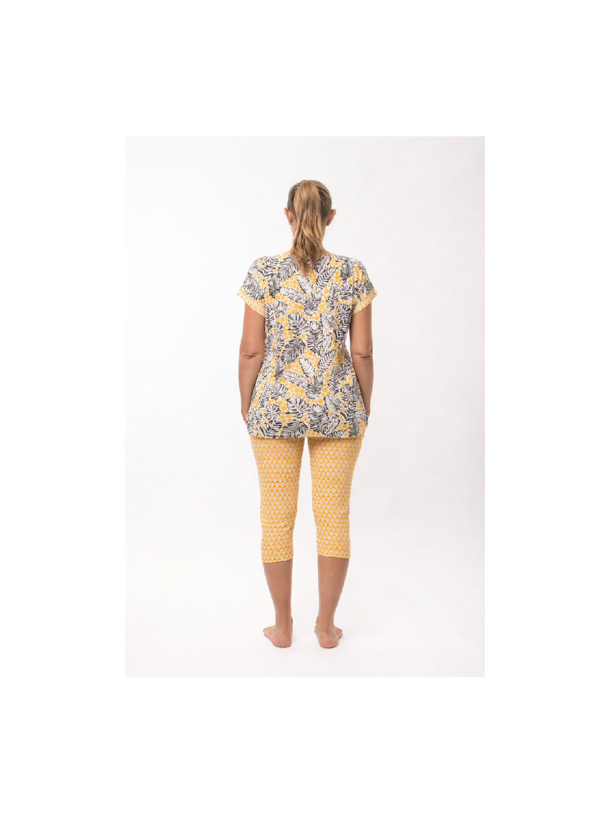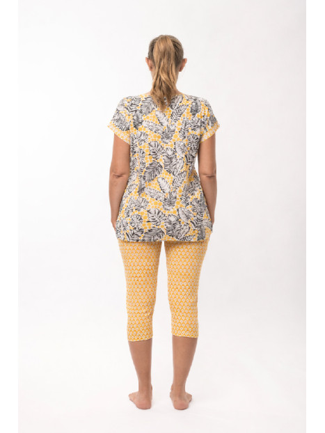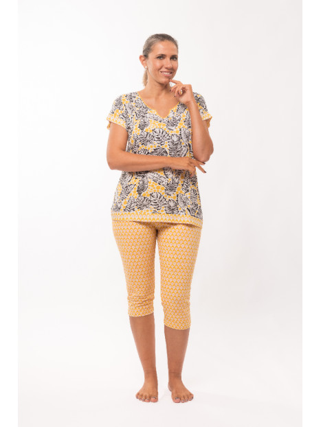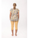 Le corsaire est en jersey imprimé. Le motif de petite taille, a une note ethnique, de coloris jaune, blanc et rose.